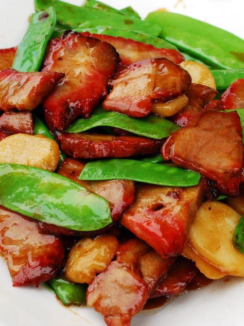 Fried green pea pods and sliced BBQ pork with garlic and house special sauce.